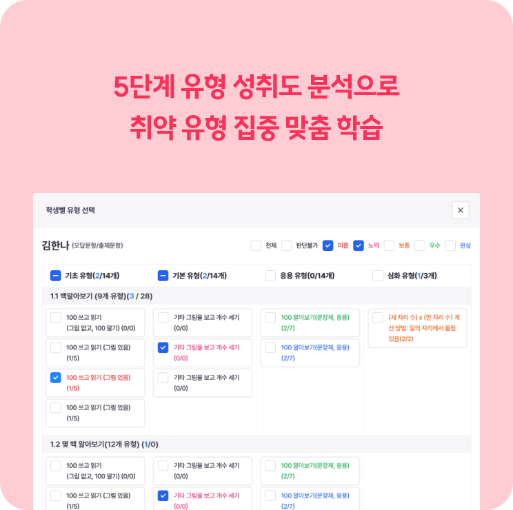 또한 오답 클리닉과 유형별 성취도에 따라 부족 유형에 대한 집중 맞춤학습이 가능합니다.