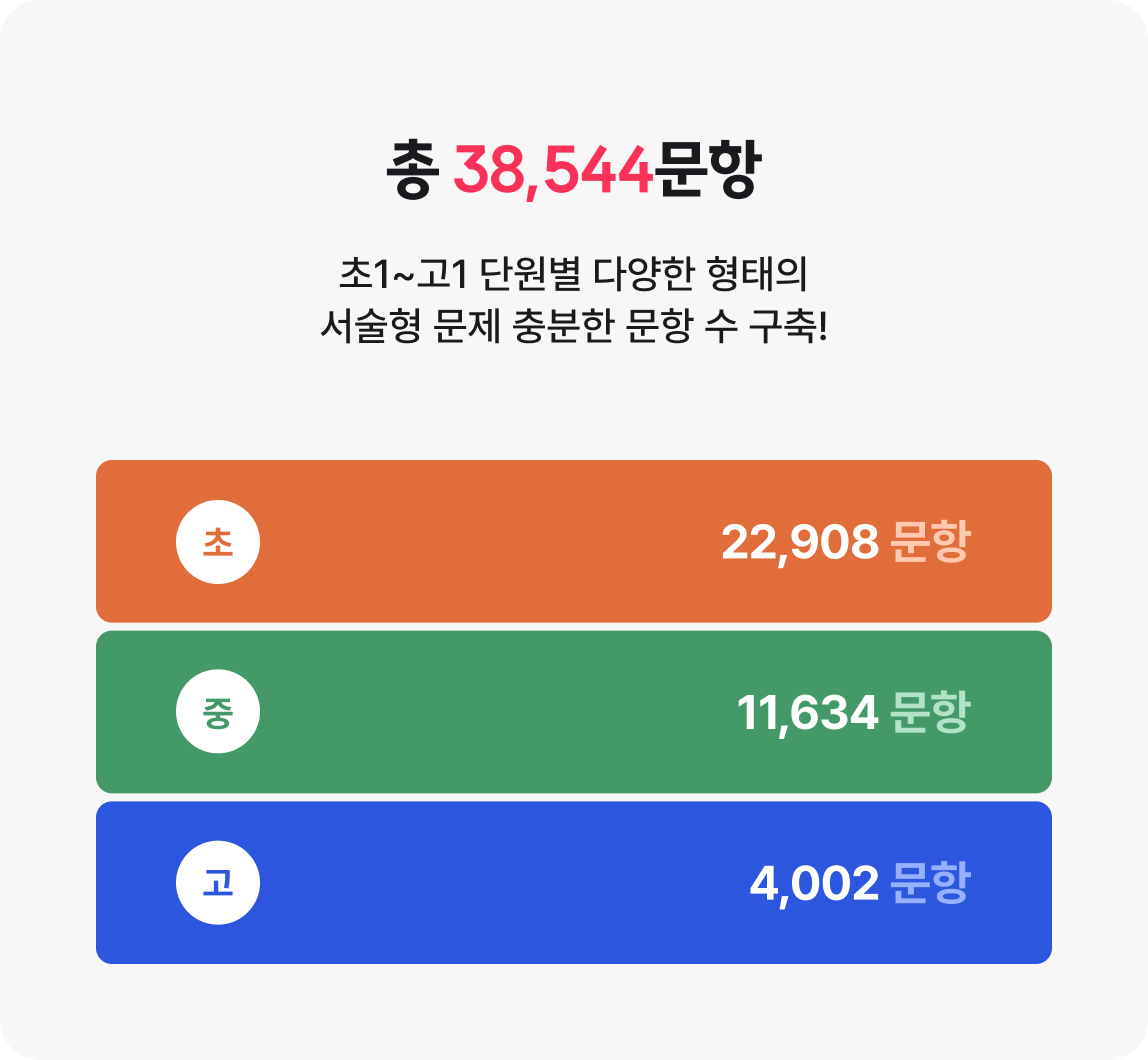 메타수학은 다양한 주관식 문제와 함께 초1부터 고1까지 서술형 DB를 완성하였습니다.