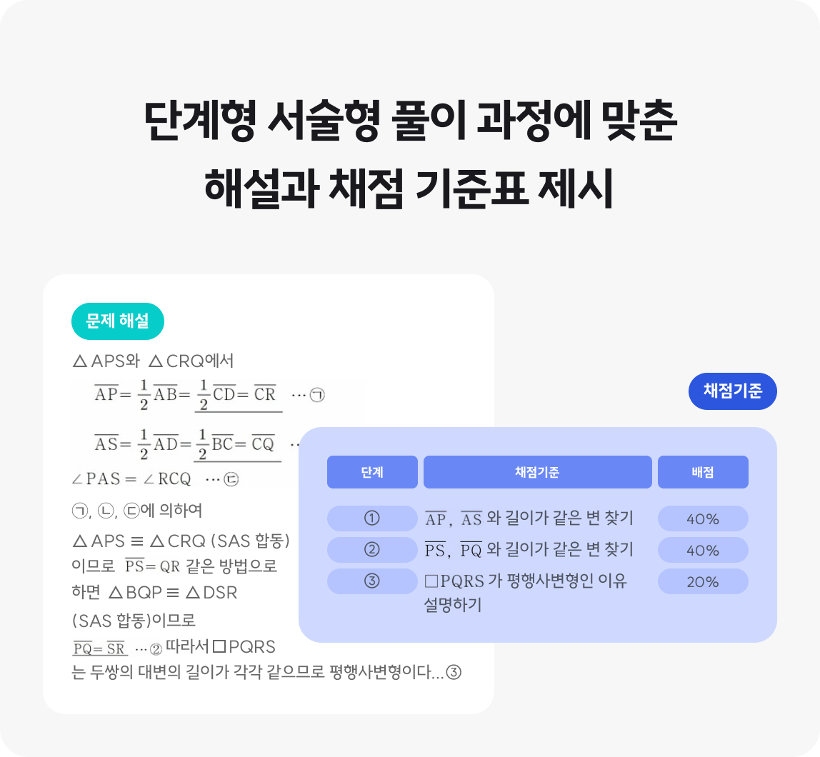 또한 수학적 과정을 고려한 서술형 풀이에 특화한 해설과 채점 기준표를 제시하여 편리하게 학습 지도와 채점을 할 수 있습니다.